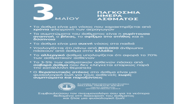 Η 3η Μαΐου είναι για φέτος η ημέρα που γιορτάζεται η Παγκόσμια ημέρα άσθματος. Το βασικό μήνυμα είναι